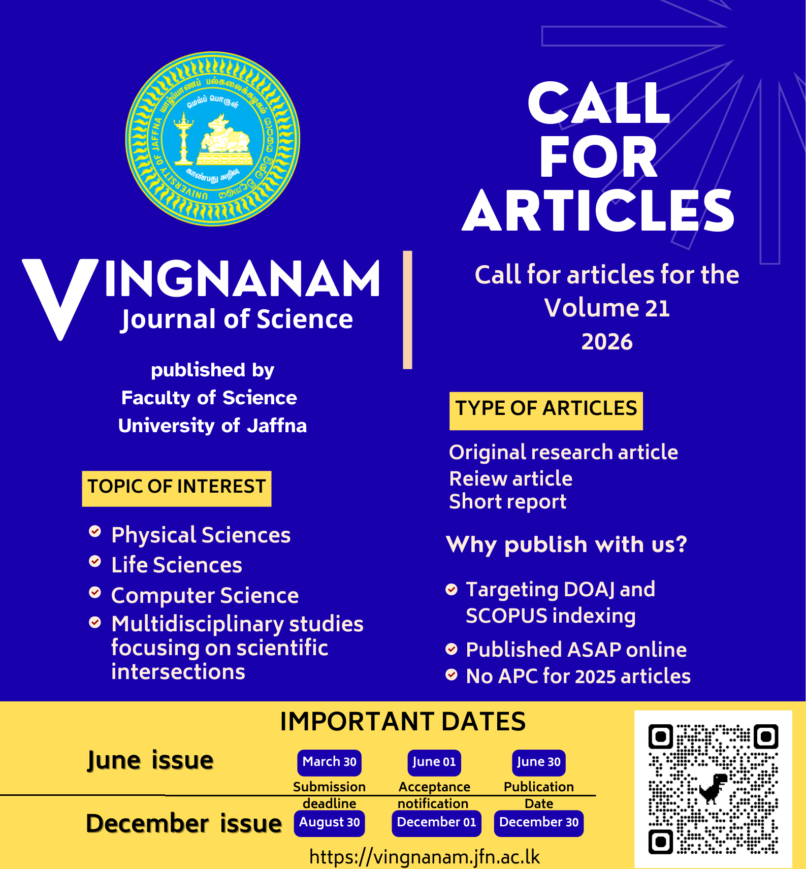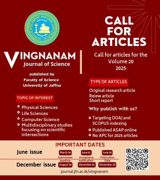 Vingnanam is a biannual refereed Journal of the Faculty of Science, University of Jaffna, Sri Lanka. It publishes original research papers and short research communications in the field of Science and Technology.